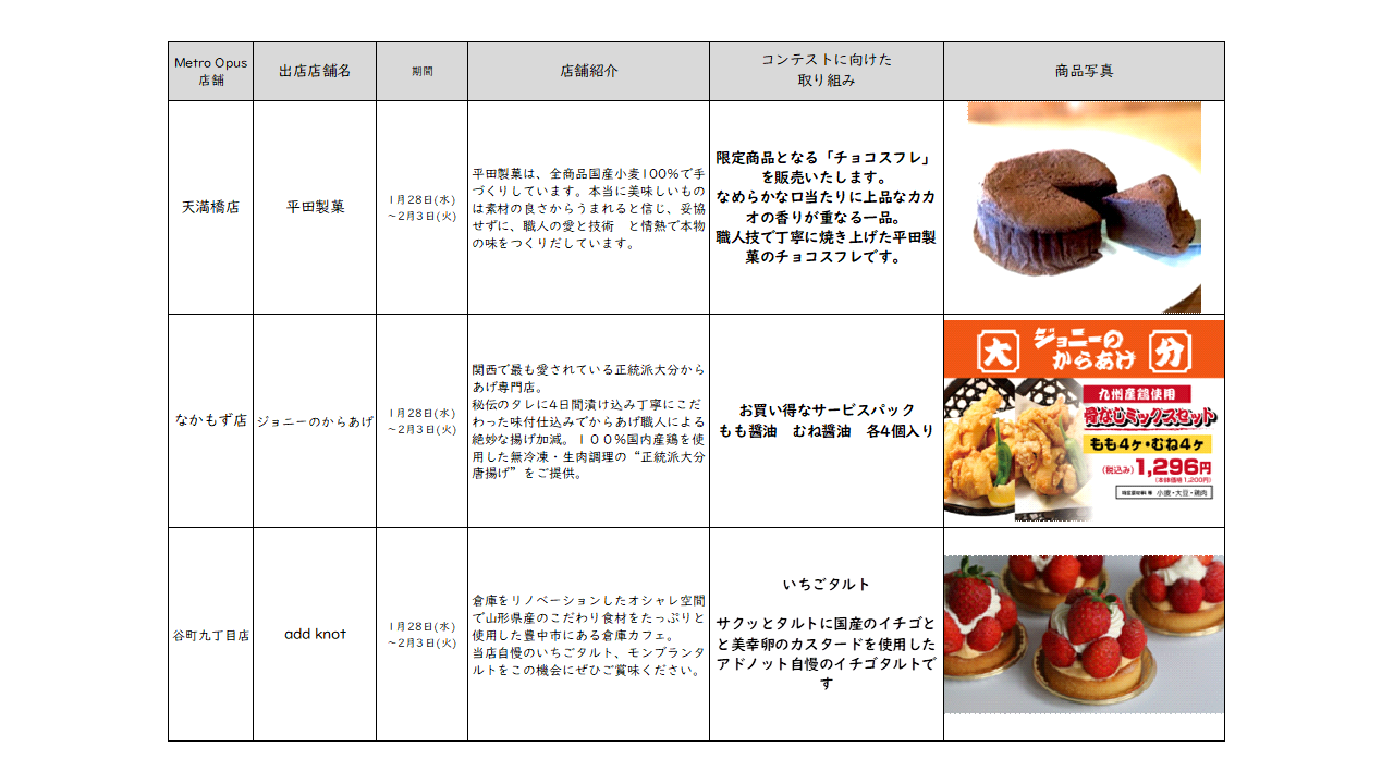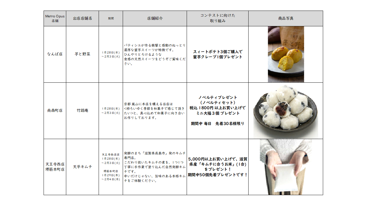 1月26日週のコンテストに向けた出店者の取り組みは以下の通りです。是非この機会にお立ち寄りください。