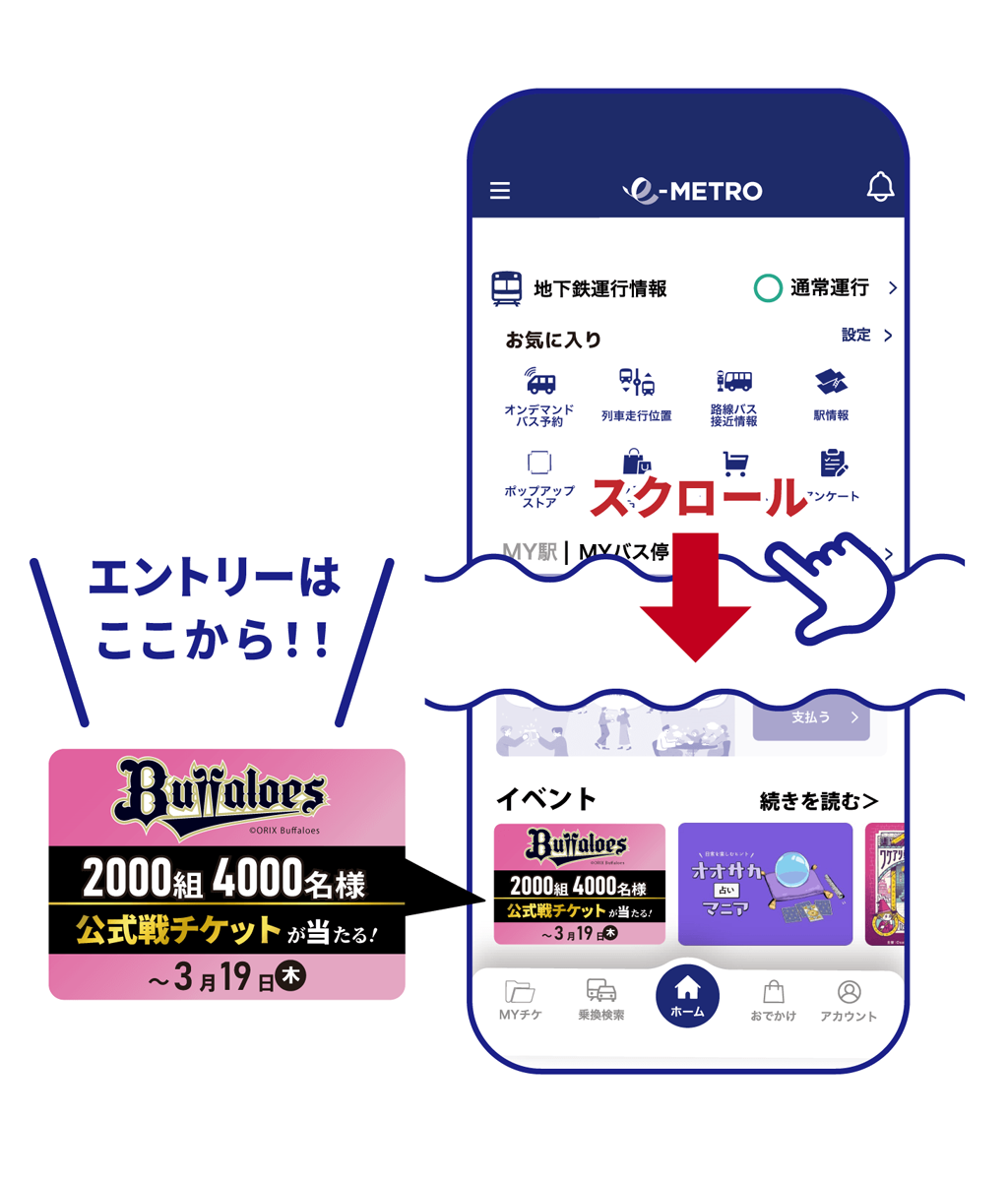 期間中に、 e METROアプリからオリックス・バファローズの応募フォームに遷移し、エントリーをされた方の中から抽選で2,000組4,000名様にオリックス・バファローズ主催1軍公式戦観戦チケットをプレゼント!