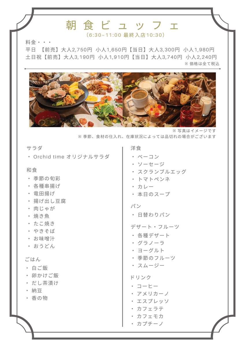 | 営業時間 | ・朝食ビュッフェ:6:30~11:00(最終入店10:30) ・ランチ:11:00~17:00(L.O.16:30) ・ディナータイム:17:30~23:00(L.O.22:00) |